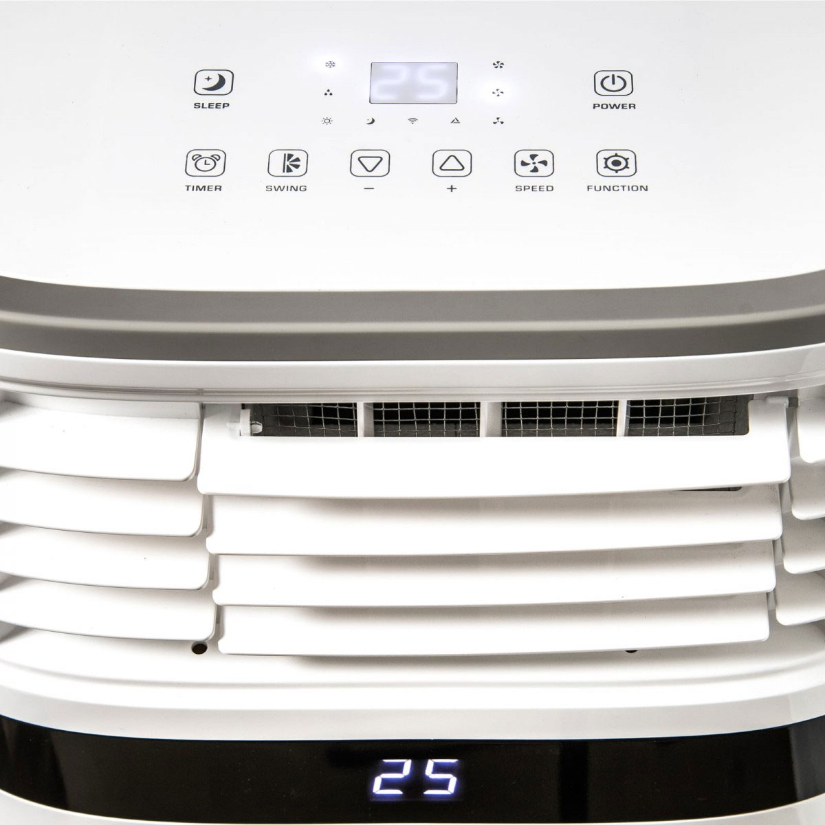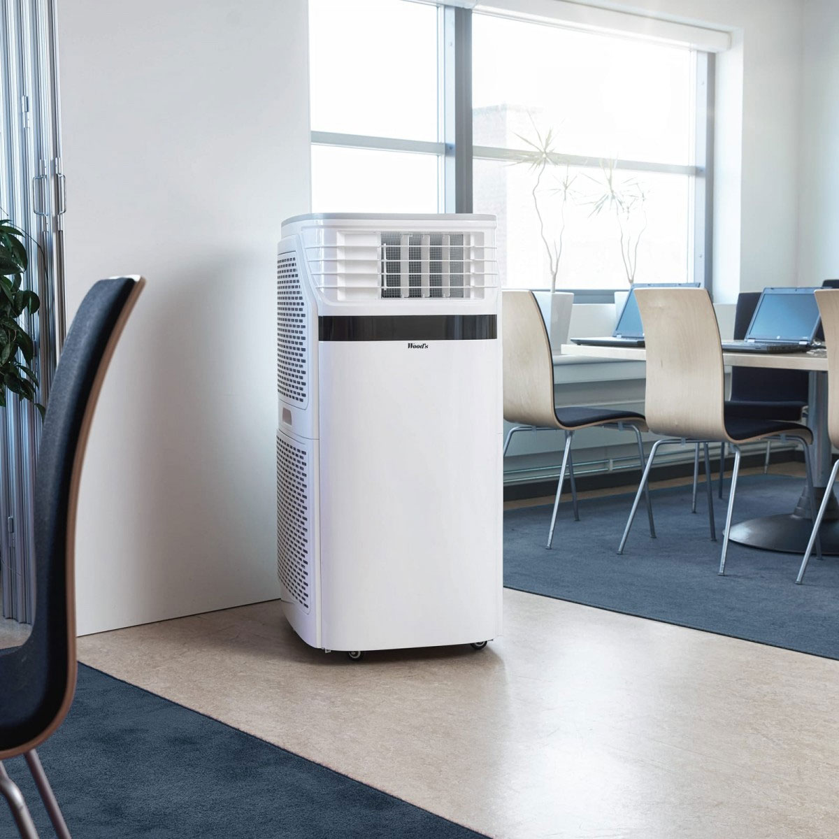 Monté sur roulettes, ce climatiseur reste mobile malgré son gabarit, ce qui facilite son repositionnement.