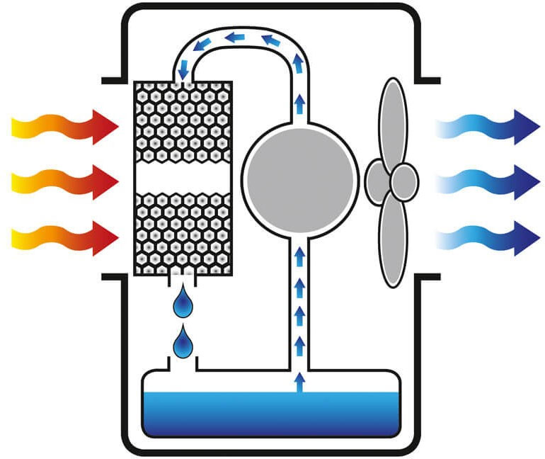 Le fonctionnement repose sur un panneau alvéolaire en cellulose alimenté en eau par une pompe intégrée. L’air chaud aspiré traverse ce média humidifié, ce qui provoque une baisse de température avant diffusion dans la zone à traiter.